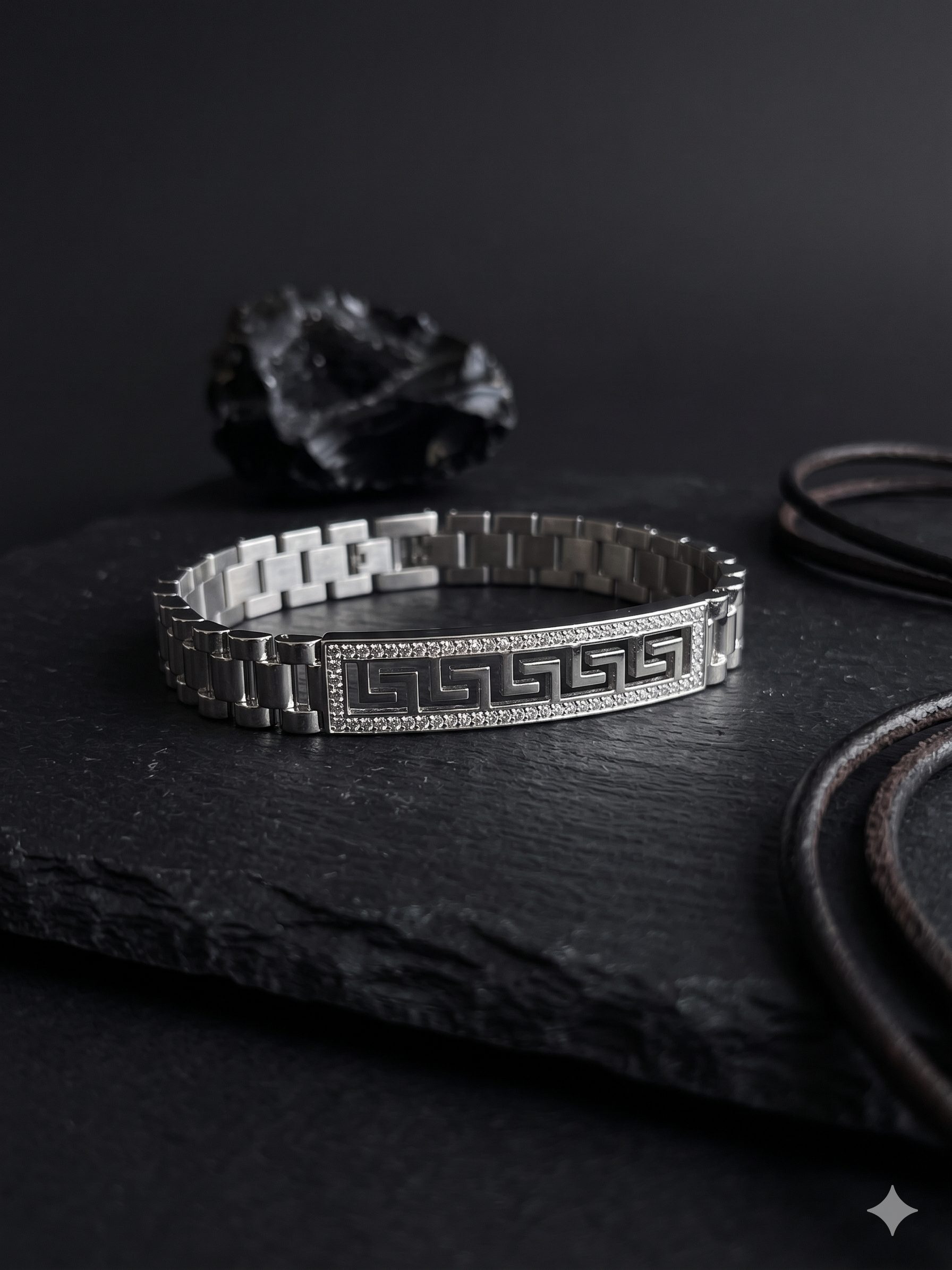 El protagonismo lo tiene su eslabón central de gran tamaño cubierto de circonitas, que aporta un brillo sofisticado y llamativo. Además, incorpora una cenefa decorativa inspirada en el estilo Versace, añadiendo un toque distintivo y de alta gama que eleva su estética.